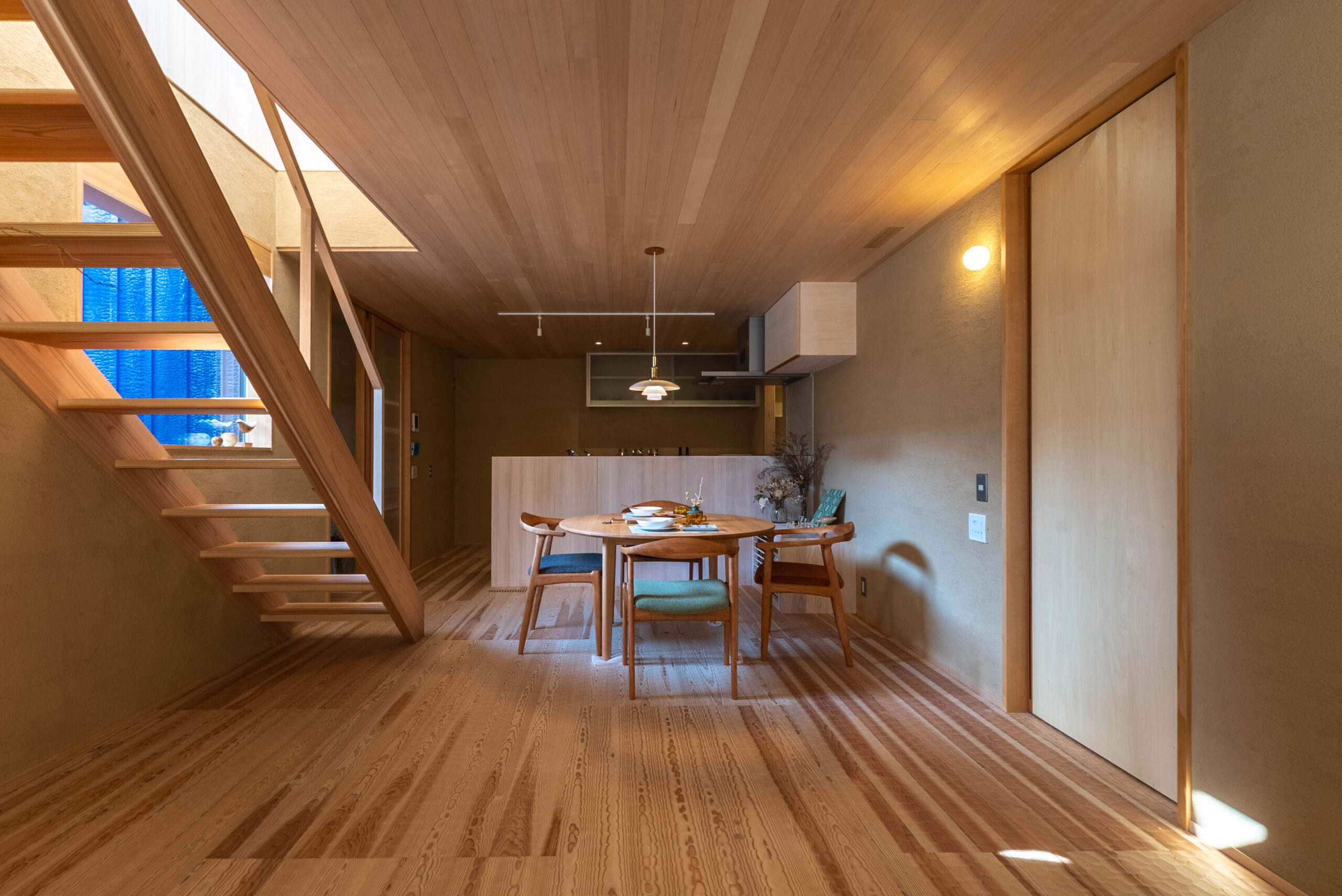 階段越しに差し込む光が、奥行きのある陰影をつくり、ただの移動の場ではなく、暮らしの風景としての“動き”を感じさせる。