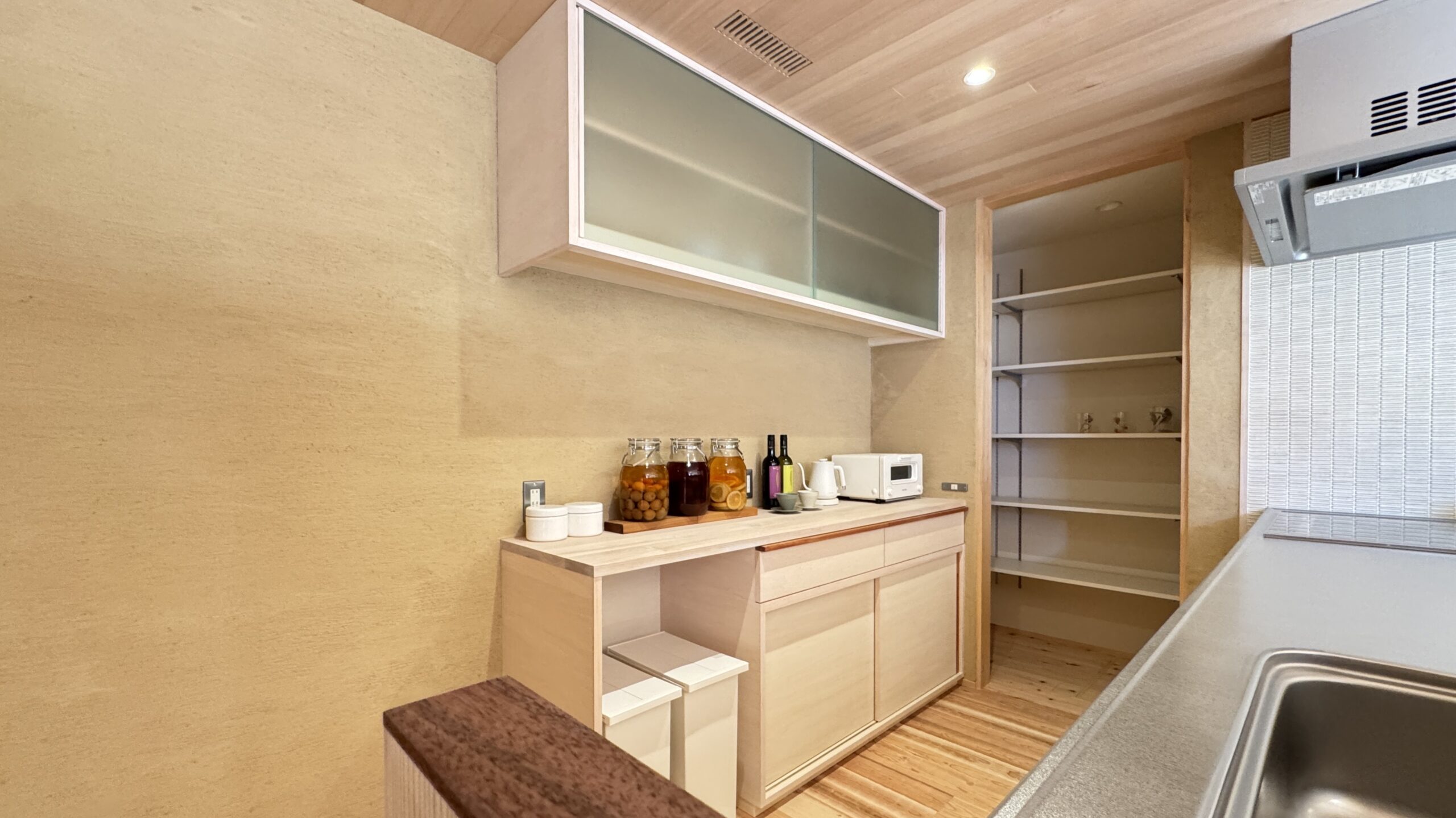 薩摩中霧島壁の穏やかな質感と、低く抑えた天井の木目が、