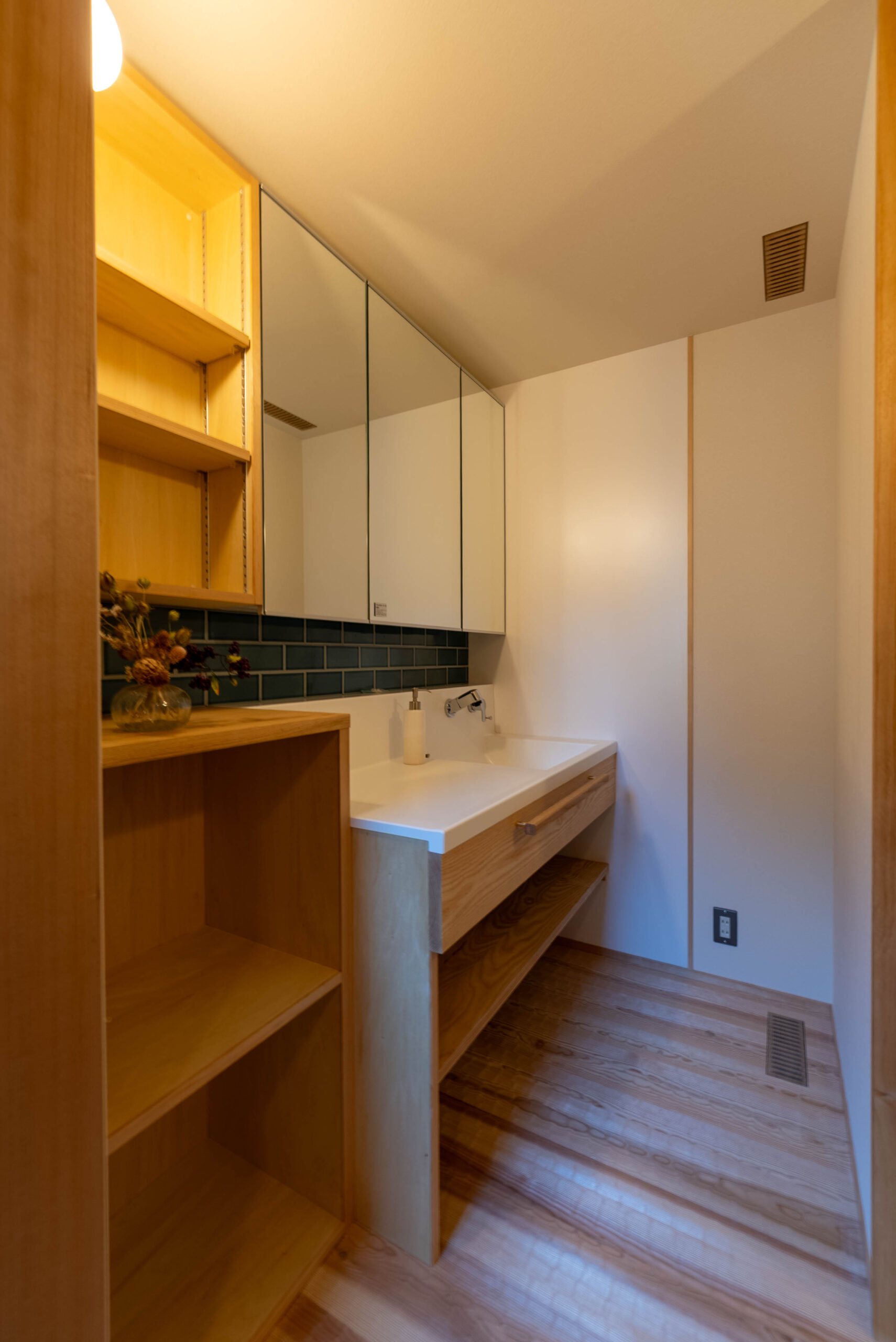 鏡面収納の下に走る深いグリーンのタイルが、