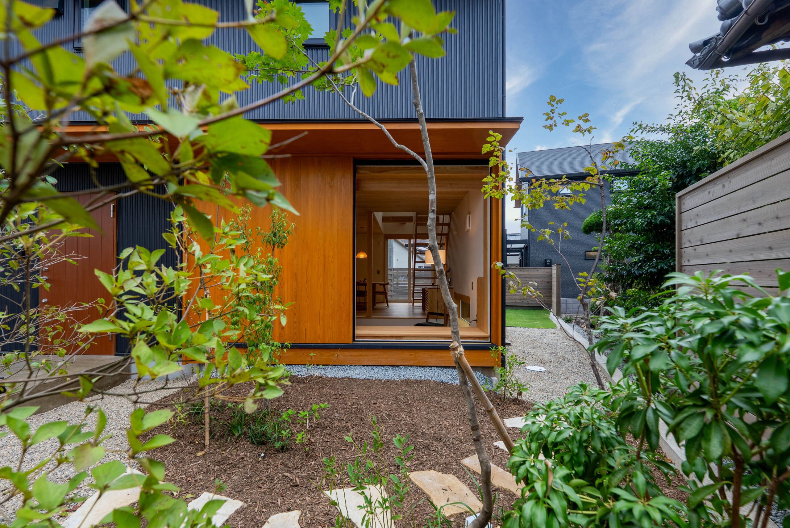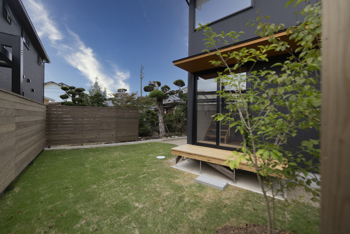 こちらの庭は、南側に設けたもうひとつの庭です。玄関アプローチから見える北側の庭が人の気配を感じられる「ひらけた庭」だとすれば、こちらは木製フェンスで囲い、外部からの視線を遮った「閉じた庭」としています。