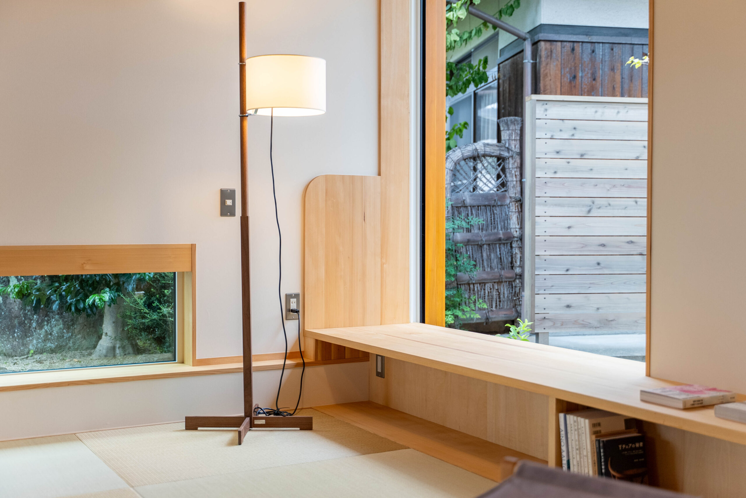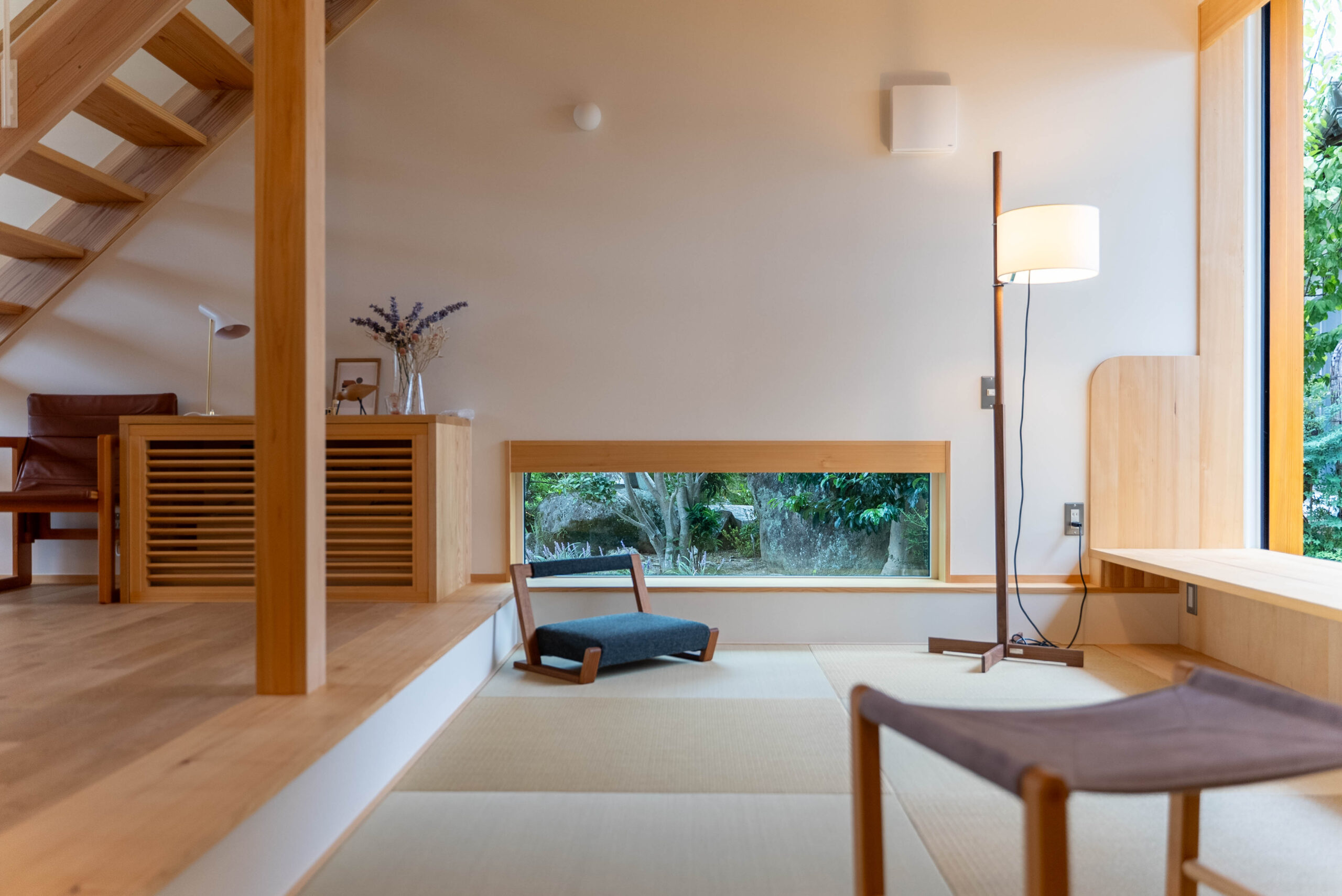 窓辺に腰を下ろせば、外から見ていた緑が額縁に収まるように広がり、読書や昼寝の時間を静かに包み込みます。