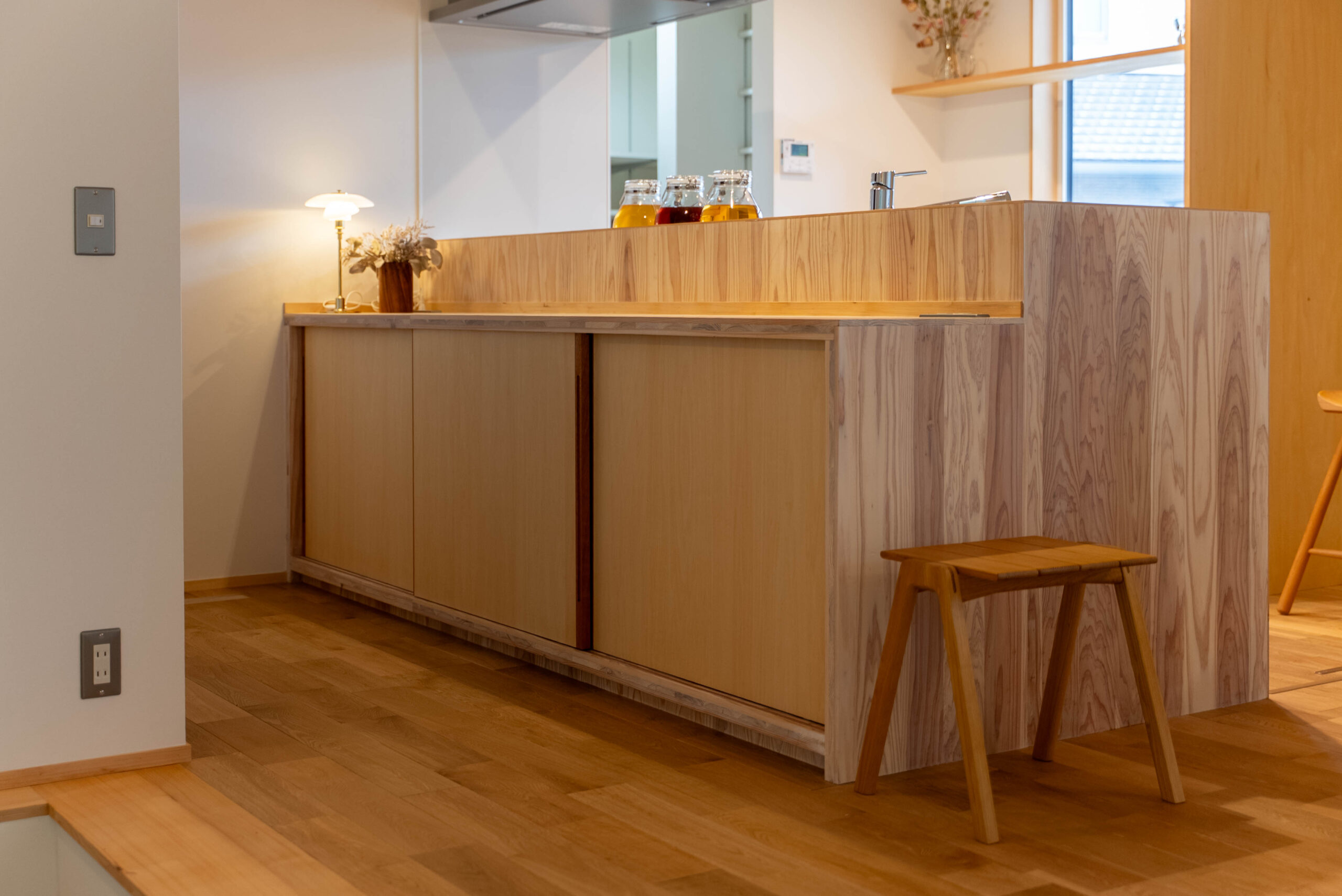 この家ではTOTO製のキッチンを採用しつつ、空間全体の木の質感になじむよう、背面には木製の収納扉を、側面には木製のサイドパネルを造作。