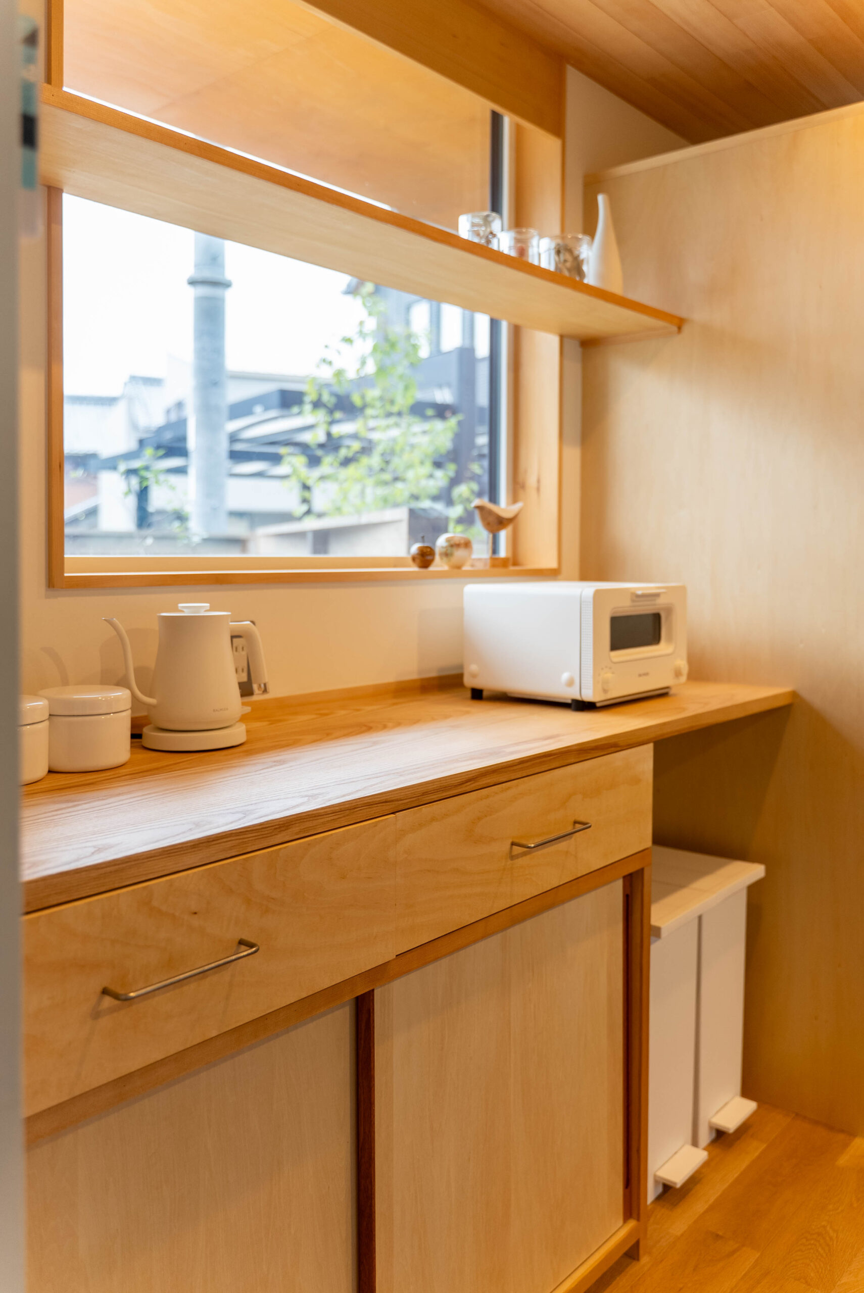 炊飯器やトースターなど日常的に使う家電を置きつつも、木の柔らかな質感が空間に温もりを与えてくれます。