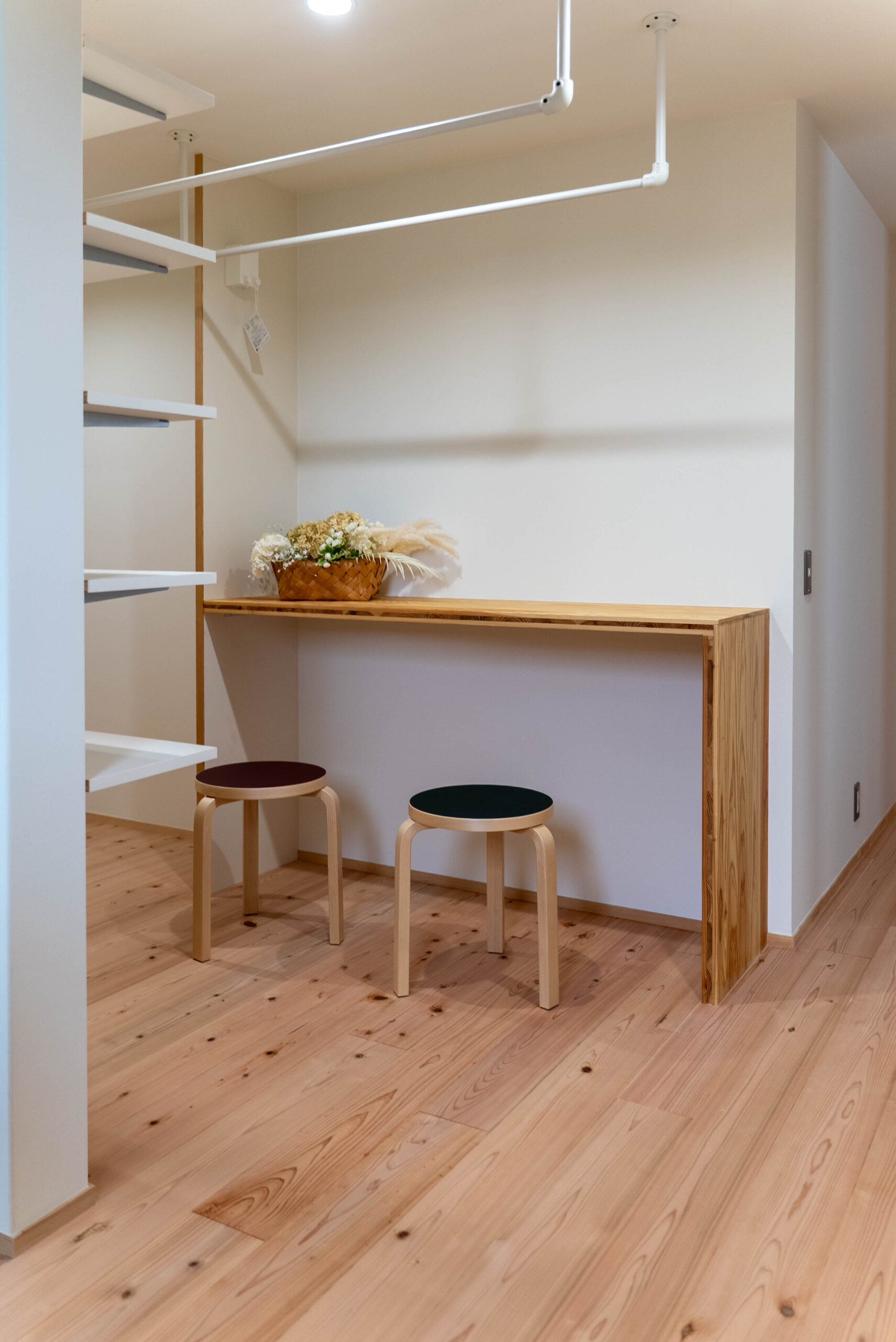 すぐ後ろには物干しスペースを配置し、洗濯物を掛けながらアイロンをかけたり、乾いたものをすぐに畳んだりと、効率的に作業が進められるようにしました。